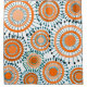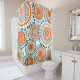Ce rideau de douche a un design d'anneaux et de cercles dans les tons orange avec des lignes turquoises qui traversent derrière eux formant des fleurs sur un champ de blanc.