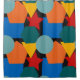 Ce rideau de douche a un design Bauhaus de formes aléatoires en bleu, turquoise, jaune, rouge et orange.