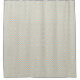 Front view displays a shower curtain with a subtle pattern of small, colorful diamonds. The in-situ image shows it hanging in a neutral-toned bathroom.