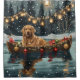 Jetez un coup d'oeil à la magie de la saison des Fêtes avec cette illustration magnifiquement détaillée, montrant un chien fier assis dans un bateau à la décoration festive, glissant à travers un lac serein de Noël. Les lumières scintillantes des pins voisins se reflètent dans l'eau, projetant une lumière chaude et festive qui renforce l'ambiance cosy. Des ornements pendent des côtés du bateau, tandis que des lanternes brillantes éclairent le chemin, créant une scène qui capture l'essence véritable de la chaleur et de la joie de Noël. Cette oeuvre nostalgique apporte une touche de magie de vacances à tout espace, parfait pour ceux qui chérissent l'esprit de la saison.