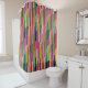 Ce rideau de douche a un design géométrique de rayures colorées courant verticalement.
