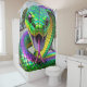 This shower curtain has a green snake on it.