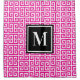 A hot pink and white Greek key maze pattern with a black and white single letter monogram.