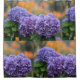 Ce rideau de douche présente une interprétation impressionniste de belles hydrangées violettes poussant dans un chalet balnéaire du Connecticut.