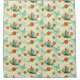 Outer space abstract with atomic rockets, satellites, galaxies, planets, space stations, and stars, in orange, aqua, black, & lime, on textured ivory.