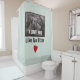 Un rideau de douche avec une photo mignonne et romantique avec 2 loutres en amour. Une loutre lèche et embrasse le petit visage de l'autre loutre, les yeux fermés à l'air heureux. Le texte dit "Je t'aime comme pas de loutre" avec un coeur de gribouillis rouge. Placé sur un arrière - plan vert menthe clair.