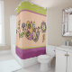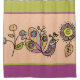 Un joli rideau de douche coloré avec un beau paon et des fleurs à l'arrière - plan de pêche, vert et violet.