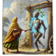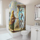 Ce rideau de douche d'imaginaire a une femme du passé rencontre un robot du futur représenté dessus.