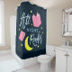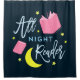 Ce rideau de douche à l'aspect bouquin porte les mots "All Night Reader" entouré de la lune jaune et d'étoiles et de livres roses contre un arrière - plan bleu foncé. *Veuillez noter que le filigrane Zazzle qui apparaît dans l'aperçu du zoom n'apparaîtra PAS sur le produit imprimé final. © Bookish and Wonderful
