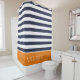 rideau de douche personnalisé avec un motif à rayures horizontales préppy en bleu marine, orange et blanc. Personnalisez-le avec votre nom monogramme ou autre texte personnalisé dans un bloc de couleurs contrasté ci-dessous. Utilisez les outils de design pour changer les couleurs arrière - plans pour correspondre à n'importe quel décor de salle de bain. Ajoutez votre propre texte et photos pour personnaliser le design et créer un rideau de douche monogrammed.