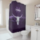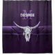 Vache occidentale crâne de vache violet blanc pays cowgirl vieux rustique monogramme salle de bain rideaux douche. Décor de ferme d'inspiration vintage. Ancien style sauvage ouest. Cool, tendance, design animal de ferme moderne. Copyright de l'image Marg Seregelyi Photography.
