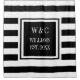 Élégant rideau de douche monogramme avec motif rayé noir et blanc avec vos initiales et nom de famille avec votre date établie dans un carré à la limite noire avec un texte blanc classique. Conçu par Thisisnotme©