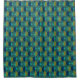 Ce rideau de douche a un design moderne du milieu du siècle des ovales en turquoise avec des demi-cercles en vert et marine à l'intérieur sur un champ de turquoise.