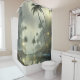 Plage côtière accueil douche rideau palmiers et océan avec des lumières scintillantes.