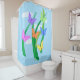 Rideau de douche gai avec mon design de six papillons de violet, vert, bleu, orange, rose et jaune sur des lames d'herbe sous un ciel bleu avec des nuages blancs bouffants.