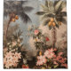 Scène tropicale luxuriante avec de grands palmiers et des fleurs vibrantes sous un ciel bleu clair. Des fruits exotiques sont accrochés aux arbres, ajoutant une touche d'abondance.