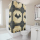 Dénim défoncé rideau de douche patchwork Halloween avec des chauves-souris en vol avec points de suture audacieux sur un arrière - plan texturé crème. Un design rustique et grandiose idéal pour un décor gothique, des fêtes d'Halloween ou des cadeaux de saison uniques.