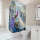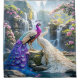 This image depicts a serene and picturesque scene featuring two peacocks standing on rocks near a waterfall. The peacock on the left has vibrant purple and blue feathers, while the one on the right is white with intricate feather patterns. Surrounding them are lush pink flowers and greenery, creating a tranquil and enchanting environment. The waterfall in the background adds to the natural beauty of the scene, making it an ideal subject for a wall mural or fabric art.