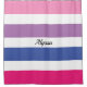 Ce rideau de douche design est décoré de rayures audacieuses de rose, violet, bleu et blanc avec typographie noire.