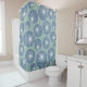 Ce rideau de douche a un design moderne du milieu du siècle de cercles bleus poussiéreux avec des éclats blancs à l'intérieur sur un champ de vert de mer.