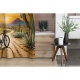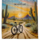 coucher de soleil tableau d'un vélo dans le désert entouré de cactus