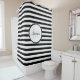 Un rideau en douche horizontal noir et blanc classique de rayures. Personnalisez ce motif à la mode en ajoutant votre initiale nommée et décorée d'un monogramme. Cette conception contemporaine de monogramme fait partie de la collection de couleur d'été de décor de salle de bains de rayures de noir.