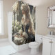 A woman in an opulent, baroque-style gown adorned with intricate lace and pearls sits gracefully on a luxurious throne. Her long, wavy hair cascades down her back, complemented by elaborate jewelry including earrings and a necklace. The setting is richly decorated with white tulips, a chandelier, and ornate drapery, evoking a sense of grandeur and historical elegance.