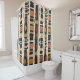 Earthy geometric pattern shower curtain inspired by tribal mudcloth textiles, featuring hand-painted rectangles, diamonds, and triangles in charcoal black and terracotta on a textured beige background. A warm boho design ideal for rustic décor lovers, artisan style fans, and anyone drawn to earthy geometric aesthetics.