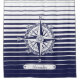 Un rideau en douche comportant une conception nautique avec un rose de boussole fleuri sur les rayures bleues et blanches et un étiquette avec le texte personnalisable.