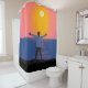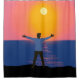 Salutation au soleil. Un homme est debout sur une plage face à la mer ouverte et salue le soleil jaune avec des bras levés.