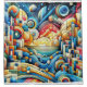 A textured artwork of an abstract colorful city with the sun rising