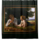 Tentation c1880 du peintre français William Bouguereau (1825 - 1905); de la période néoclassique et académique, qui créa des interprétations modernes de sujets classiques basés sur des thèmes mythologiques. Une belle et adorable peinture d'une jeune femme et d'une petite fille d'environ 3 ans se reposant sur le sol, avec la jeune femme allongée et le bébé assis à côté d'un étang avec nénuphars, dans un vaste terrain avec de multiples arbres derrière eux.