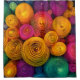 Cette œuvre d'art abstrait éclate d'énergie, de mouvement et de couleur audacieuse, attirant le spectateur dans un monde envoûtant de formes circulaires superposées. Des spirales entrelacées ondulent vers l'extérieur dans des teintes riches d'or, de cramoisi, de magenta, de sarcelle et de violet profond, créant un sens dynamique de rythme et de profondeur. Chaque motif circulaire semble vivant, comme un pouls ou une orbite, contribuant à une composition visuelle harmonieuse mais puissante.