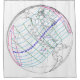 Chemin de l'éclipse solaire totale du 8 avril 2024 représenté sur une carte globale de la NASA qui montre les temps de transit et le point de la plus grande éclipse. Il est à noter que la voie étroite de la totalité pour l'Amérique du Nord commence à la frontière Pacifique du Mexique et traverse le nord-est par les États du Texas et du Midwest, en quittant la frontière orientale du Maine et en pénétrant au Nouveau-Brunswick au Canada.