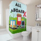 Les enfants qui aiment des trains aimeront ce rideau coloré, d'amusement de train de thème en douche comportant une locomotive et une voiture sur une voie ferrée avec le texte noir qui lit tous à bord !
