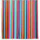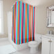Ce rideau de douche a un design simple de rayures verticales de différentes épaisseurs en rouge, orange, violet, noir, bleu clair et blanc.