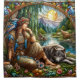 Sous un coucher de soleil doré, une Indienne, ornée de plumes vibrantes et de bijoux complexes, est assise au bord d'une rivière sereine, son fidèle compagnon de loup se reposant à côté d'elle