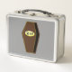 Cette somptueuse lunchbox en métal dispose d'un cercueil déplaisant en bois avec bordure dorée. Le couvercle du cercueil est légèrement ouvert et ne révèle que l'obscurité à l'intérieur. La plaque d'or à l'avant du cercueil contient un éffrayant texte noir qui indique RIP, ne donnant aucune idée de qui ou de ce qui pourrait se trouver à l'intérieur. Ce cercueil amusant mais sinistre est idéal pour Halloween. L'arrière - plan gris sombre agit pour attirer l'oeil de l'observateur vers le cercueil du malheur.