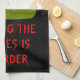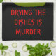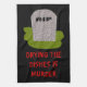 Cette superbe serviette de cuisine est ornée d'une pierre tombale grise avec RIP en laissant couler du texte noir sur elle, debout sur une parcelle d'herbe verte. L'arrière - plan est noir, et il ne respecte pas cette conception morbide. Il y a un drôle de texte rouge personnalisable qui dit "Sécher la vaisselle est un meurtre"