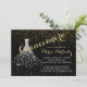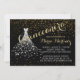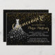 Invitations formelles de quinceanera en noir et or - Lit 'Quinceanera en haut en lettres d'or avec une ombre portée. Élégant, faux pierres de diamant de la robe formelle sur la gauche. Arrière - plan noir pour faire pop design. Bordé de points confettis de parties scintillant en faux or éparpillés en haut et en bas. Personnalisé avec le nom de la fille d'anniversaire en écriture chic, écriture or. Informations personnalisables sur la fête du 15e anniversaire, y compris les détails RSVP, imprimées en blanc. Il vous suffit de remplir vos propres détails officiels de quinceanera avec le modèle texte facile à utiliser. Le dos est assorti d'une parties scintillant en faux or et d'un arrière - plan noir solide. Invitations de fête d'anniversaire chic et glamour prêts à être personnalisés. Complète les couleurs d'anniversaire noir et or ainsi que des thèmes de fête élégants et formels.