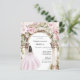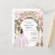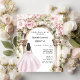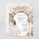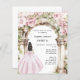 Une grande arche en marbre décorée de fleurs roses. Une fille avec une robe rose pâle. Personnalisez et ajoutez un nom et des détails. 1 feuille = 1 invite imprimé bord à bord.