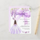 Un élégant arrière - plan blanc, décoré d'une grande lavande, d'un arc de couleur violet, de fleurs de glycine, de papillons et d'une fille en robe. Personnalisez et ajoutez un nom et des détails du parti. 1 feuille = 1 invite imprimé bord à bord.
