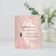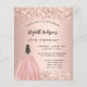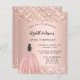 Une invitation moderne, élégante et glamour pour une fête d'anniversaire du 18ème (ou tout âge). Un arrière - plan rose en or avec de la poussière de parties scintillant en faux or, une fille portant une robe de bal. Le nom est écrit avec un script de style moderne écrit à la main. Personnalisez et ajoutez les détails de votre fête. 1 feuille = 1 invite imprimé bord à bord.