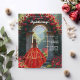 Une grande arche en marbre décorée de roses rouges, de fleurs. Une fille avec une robe rouge et or portant une tiare. Personnalisez et ajoutez un nom et des détails. 1 feuille = 1 invite imprimé bord à bord.