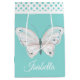 Sac-cadeau de taille moyenne et chic fait en bleu d'oeuf de robin, avec des graphiques d'un joli papillon blanc, à l'avant et à l'arrière, et bande de pois de polka, autour du sommet. Personnalisez le texte blanc, à l'avant du sac, pour lire ce que vous voulez. Un grand sac cadeau et du papier de tissu assorti sont disponibles.