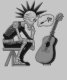 Un robot aux cheveux pointus et à l'expression confuse est assis sur un tabouret, réfléchissant à l'endroit où le plugin se connecte sur une guitare acoustique. La bulle de pensée au-dessus de sa tête contient un bouchon de guitare et des points d'interrogation, indiquant la contemplation et la confusion.