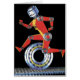 Illustration vintage de science-fiction design mettant en vedette un robot heureux et souriant fait de pièces de machine. La femme ou l'homme futuriste a un sourire et court avec un engrenage, un pignon ou une roue sur un tapis roulant. Un gars ou une fille de science-fiction sain courant pour sa santé, courant vers l'avenir !