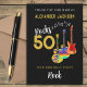 Rock and roll carte de remerciements fête de 50ème anniversaire avec trois guitares funky cool et la typographie or sur arrière - plan noir. Guitare électrique avec motif à flamme et garde-pick rouge, guitare semi acoustique multicolore et illustration de guitare acoustique classique psychédélique avec typographie cool moderne en noir et or personnalisée. Ce modèle facile à utiliser pour changer l'âge et le nom crée la fête parfaite Merci sticker sac pour célébrer cinquante dans le style rock n roll et est idéal pour un guitariste, musicien et mélomane amoureux. N'importe quel guitariste vous dira que vous ne pouvez jamais avoir trop de guitares. Ce design cool d'instruments de musique moderne célèbre l'énergie musicale de ce merveilleux instrument de musique et est la façon parfaite de faire du rock une célébration du cinquantième anniversaire. OEuvre originale de l'artiste Catherine Sweetman
