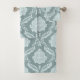 A vintage style decorative damask surface pattern influenced by rococo classical design in duck egg blue color detail on a teal background.