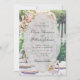 This romantic wedding invitation features a soft garden reception setting with delicate pink florals, elegant table details, and a refined ornamental frame that creates a luxurious, storybook atmosphere. The floral backdrop and candlelit reception styling evoke an intimate outdoor celebration filled with warmth, beauty, and timeless romance.